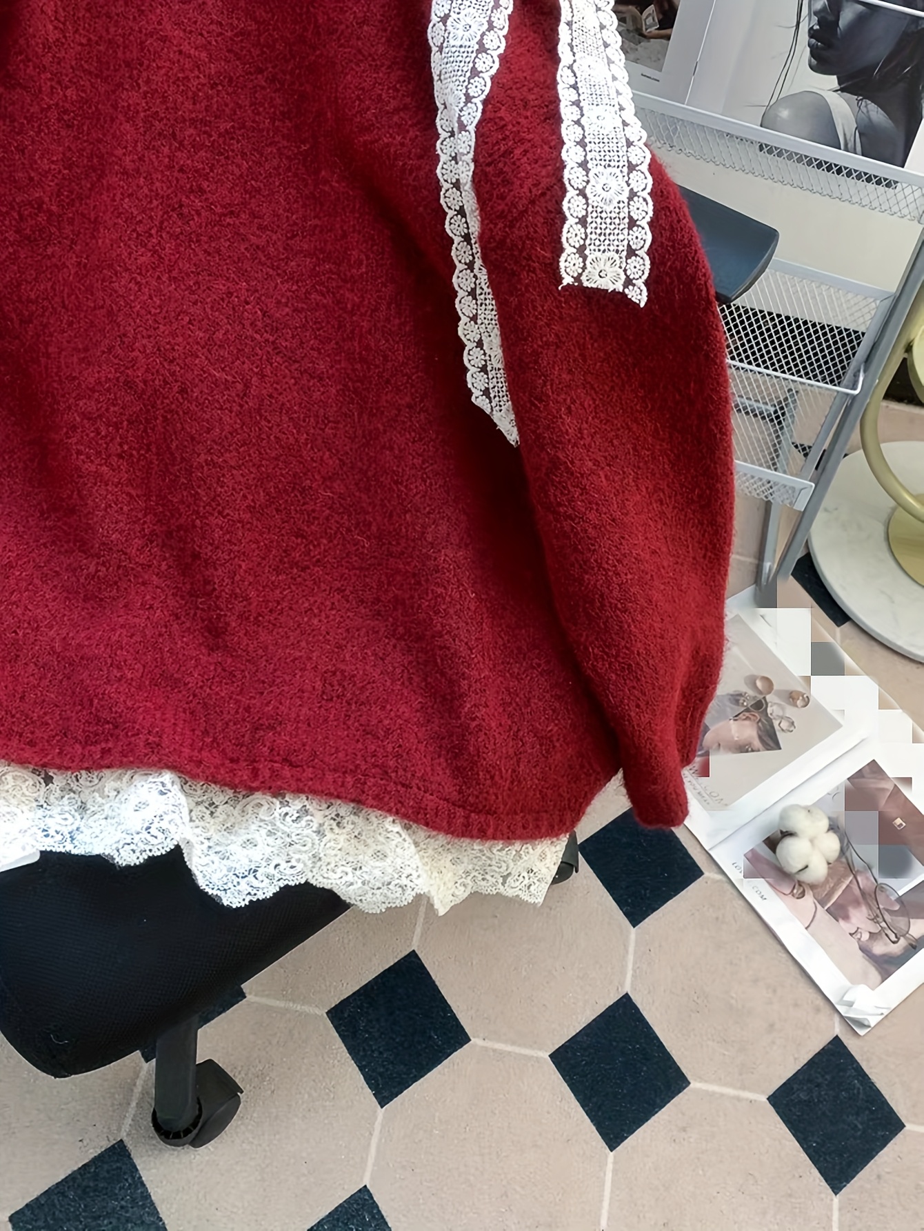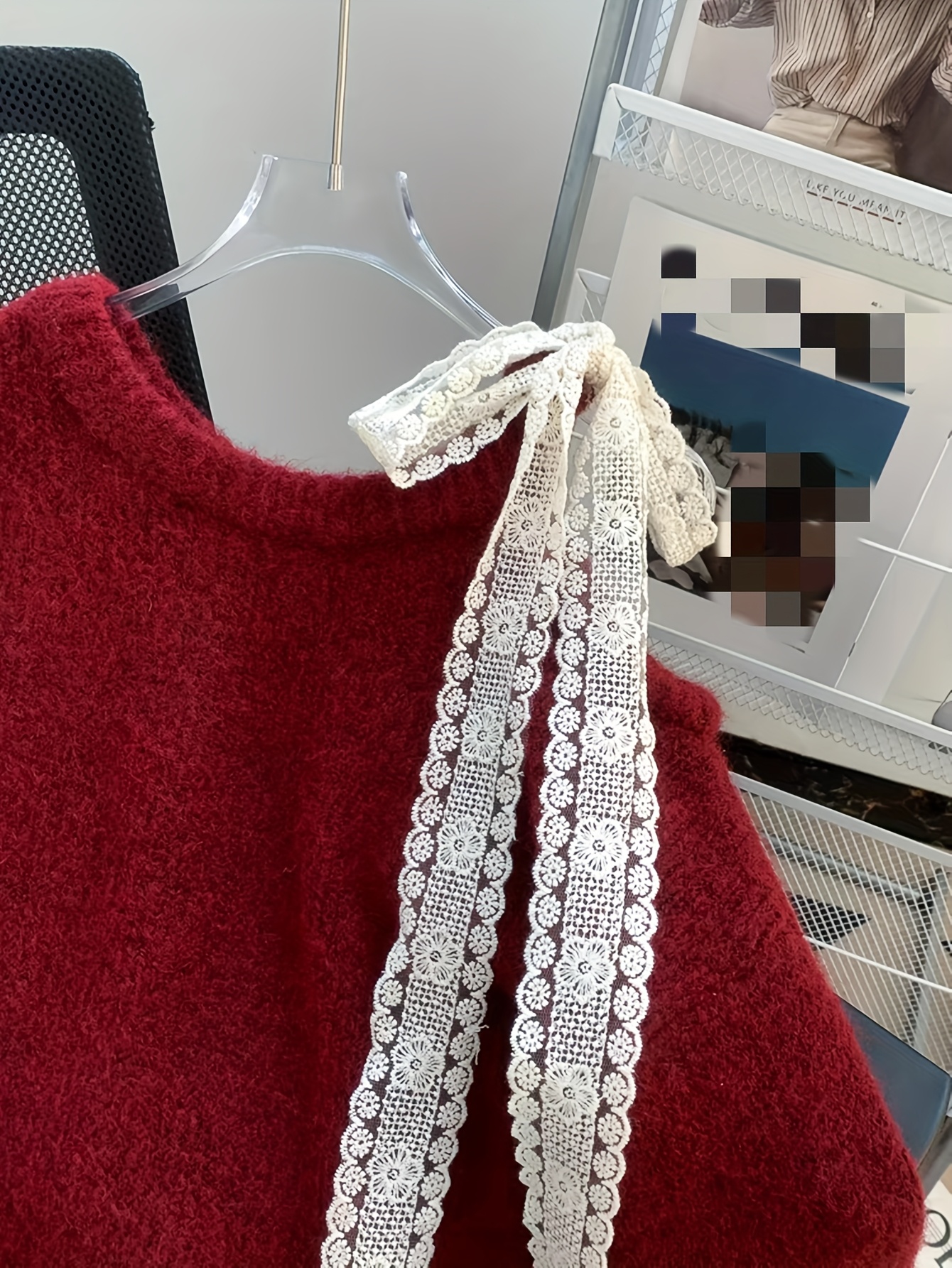 European and American Autumn-Winter New Fashion Heavy-Duty Contrast Lace Splicing Bow Mid-Length Sweater Pullover Jacket for Women