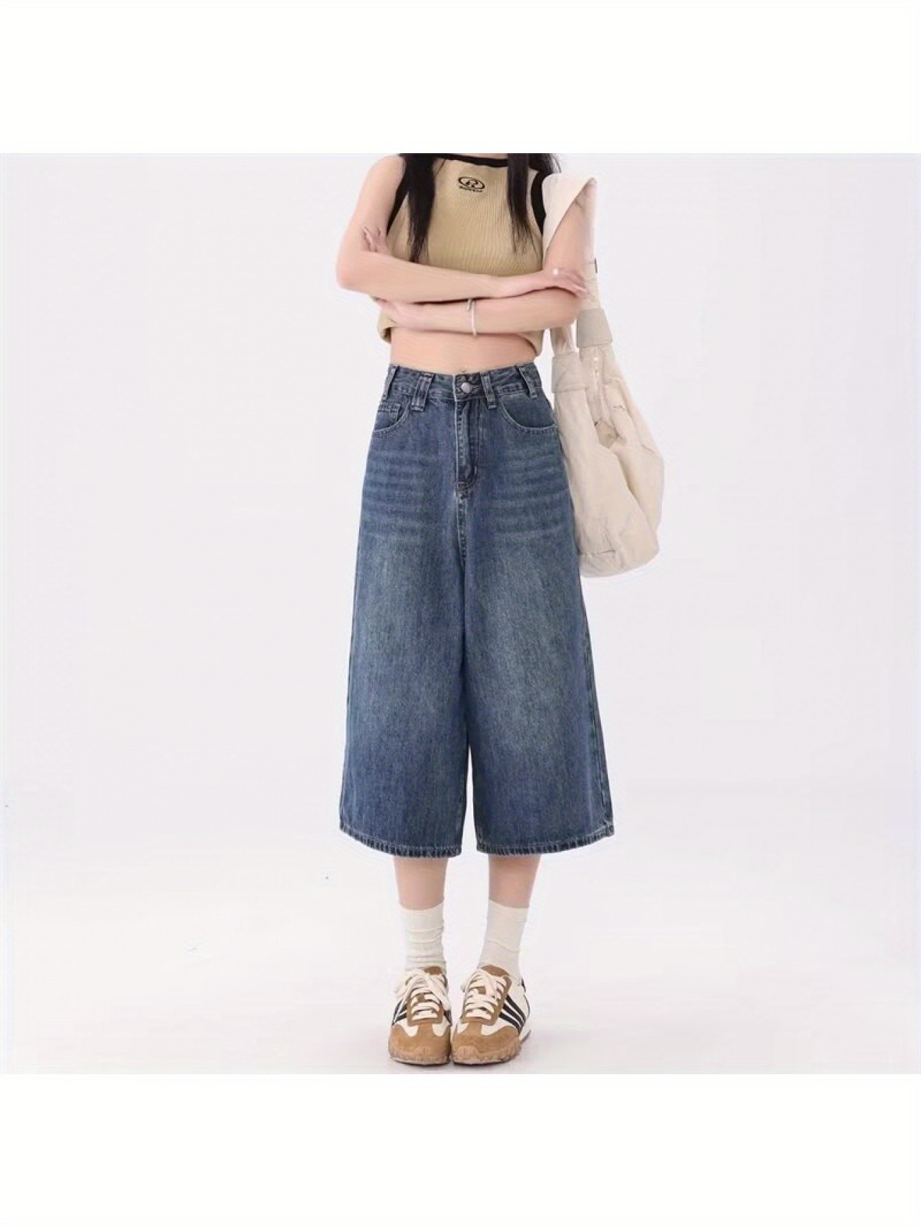 Loose Wide-Leg Cropped Jeans Women- Summer New High-Waist Retro Style Washed Distressed Straight Leg Bermuda Shorts Fit