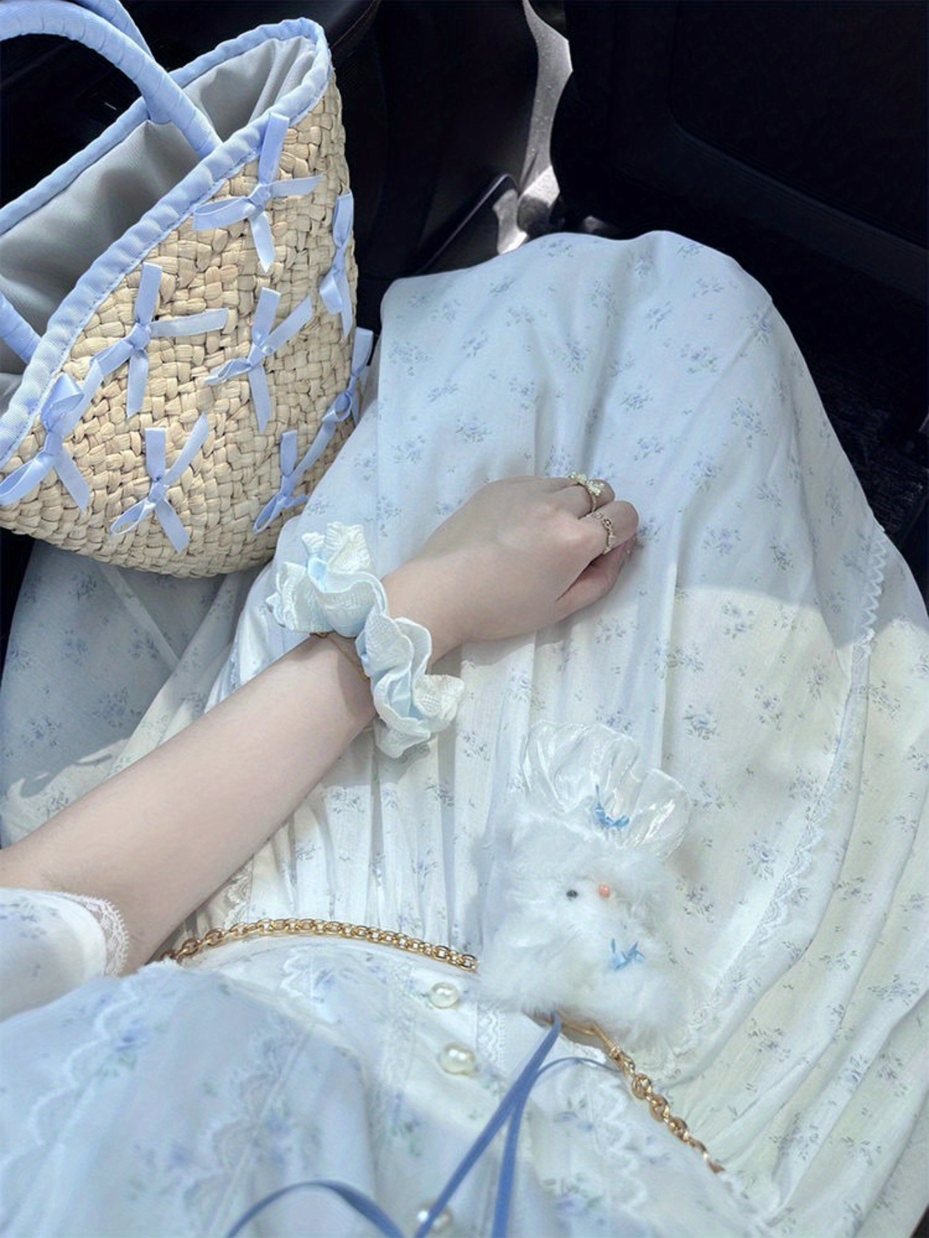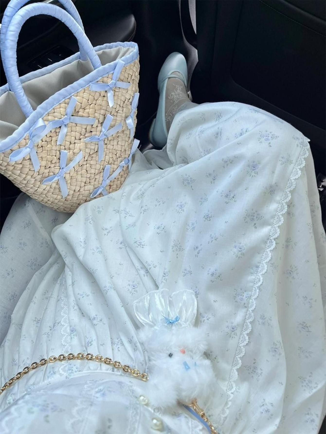 Women's Elegant Floral Print A-Line Dress with Spaghetti Strap & Smock Neckline - Slim-Fit Waist, Full Skirt, Blue Floral Pattern on White - All-Season Semi-Sheer Long Dress for Casual to Semi-Formal Events, Hand Washable Lightweight Fabric